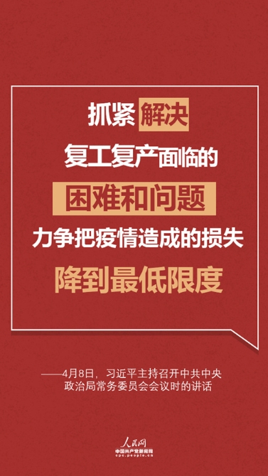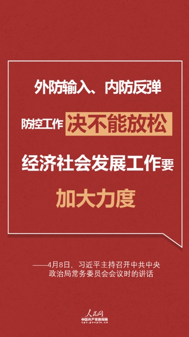 【编者按】中共中央政治局常务委员会4月8日召开会议,听取新冠肺炎疫情防控工作和全国复工复产情况调研汇报,分析国内外疫情防控和经济运行形势,研究部署落实常态化疫情防控举措、全面推进复工复产工作。习近平主持会议并发表重要讲话。据统计,这是自疫情发生以来,习近平第九次主持召开中央政治局常务委员会。本次会议上,习近平总书记有何最新部署?人民网·中国共产党新闻网为您梳理。