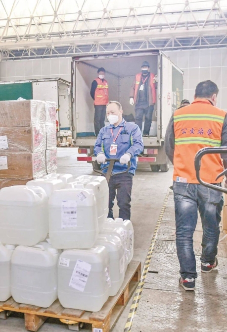物资从外地到了武汉的火车站、港口,还得尽快地转运到位。由此,一个公路运输应急网形成。武汉市交通运输局构建了以国博中心仓库及宝湾、捷利、萃元物流园为主体的“1 3”防疫物资储运分拨平台,实现应急物资高效转运分拨。2月2日以来,国博中心共转运分拨27.8万件、约1万吨医疗类物资;三大中转站转运物资5275.72吨,其中医疗类物资789.1吨,生活类物资4549.4吨。