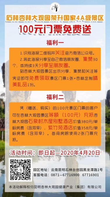 昆明信息港讯(昆明日报 全媒体记者李思凡)近日,昆明市石林杏林大观园景区成功晋升为国家4A级旅游景区。即日起至4月20日,游客关注景区官方微信公众号并参与朋友圈集赞活动,就能领取价值100元的景区门票1张以及杏林定制精美礼品1份。