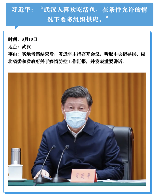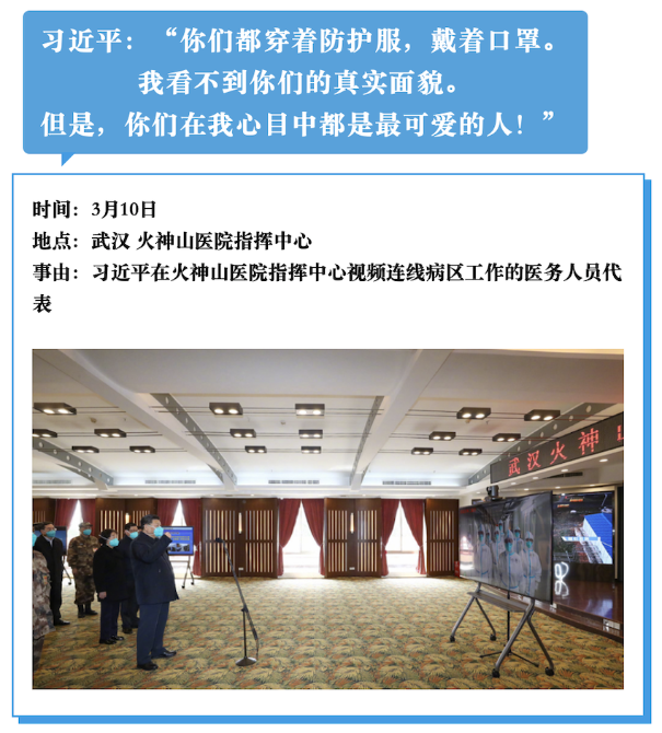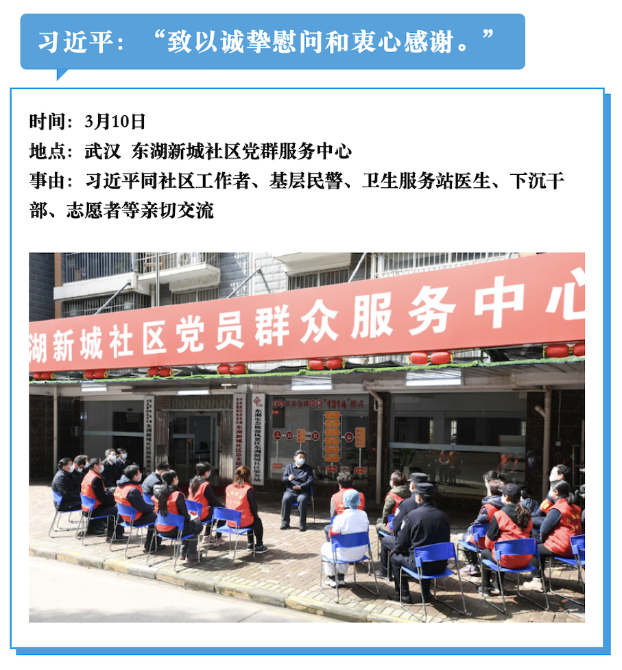 一个月后,3月10日,在抗击新冠肺炎疫情的关键时刻,习近平专赴湖北省武汉市考察疫情防控工作,看望慰问奋战在一线的医务工作者、解放军指战员、社区工作者、公安干警、基层干部、下沉干部、志愿者和居民群众。