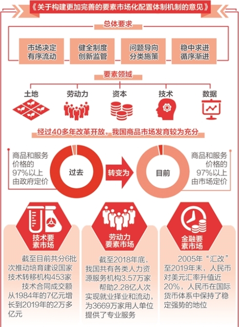 完善要素市场化配置是建设统一开放、竞争有序市场体系的内在要求,是新时代加快完善社会主义市场经济体制的重要内容。4月9日,中共中央、国务院印发《关于构建更加完善的要素市场化配置体制机制的意见》(以下简称《意见》),明确了要素市场制度建设的方向及重点改革任务,并就扩大要素市场化配置范围、促进要素自主有序流动、加快要素价格市场化改革等作出了部署。