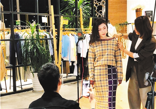 广州一服装商家正在直播服装新品。 记者郑杨摄