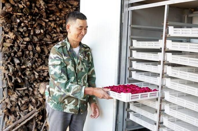 据峨山县云翔玫瑰专业产销合作社负责人郑三军介绍,2013年底,自己与方顺旺等十多位种植户在雨龙村培育金边玫瑰,2014年初收获了第一批花苞。从自然晾晒到使用烤箱烘干,郑三军带领种植户进行了反复试验,前往多地考察。现在,郑三军不仅能准确辨识植株健康状况、烘烤技术疏漏,教会种植户如何改进,还在品种引进、物流等方面有收获。不少村民看到跟着郑三军种植食用玫瑰这一“美丽事业”前景广阔,随后转变农业产业发展方式,种植起了玫瑰。2017年7月,郑三军与方顺旺等60多人共同成立了峨山县云翔玫瑰专业产销合作社,通过合作社推动玫瑰花产业规模化、专业化发展。