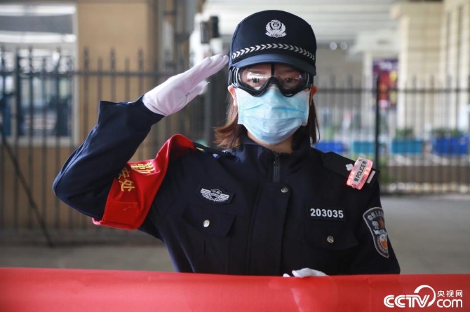 一位女民警在向援鄂医务人员致敬。