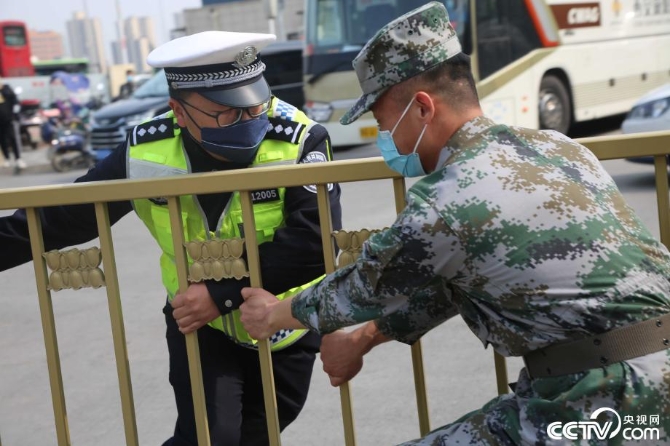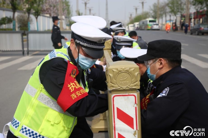 援鄂医务人员车辆平安驶离后民警快速恢复道路隔离设施。