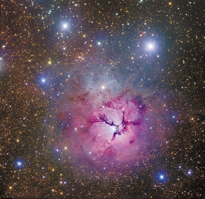 人马座的三叶星云为发射星云,被周围O、B型恒星猛烈的紫外辐射激发,发出亮光。红色来自于氢(Hα)辐射,绿光则来自于氧,黄、褐等颜色来自于硫和其他离子。NASA