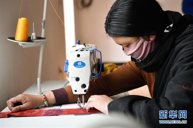 在青海省玉树藏族自治州加吉娘社区民族服饰加工车间,当地牧民索南看卓在缝制布饰(4月3日摄)。新华社记者 张龙 摄