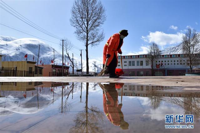 一名环卫工人在青海省玉树藏族自治州玉树市扎西大同村的广场清扫垃圾(4月6日摄)。新华社记者 吴刚 摄
