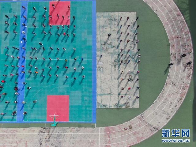 在青海省玉树藏族自治州八一孤儿学校,学生们在进行课间活动(4月3日摄,无人机照片)。新华社记者 张龙 摄