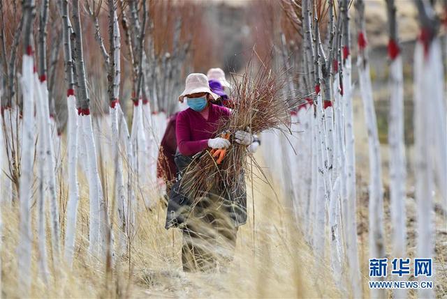 在青海省玉树藏族自治州高原千亩林木良种繁育实验基地,当地群众在清理修剪过的树枝(3月29日摄)。新华社记者 张龙 摄