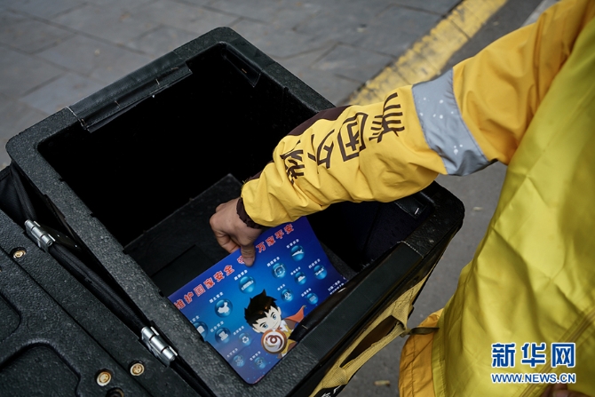 王淞将需要配送的餐饮品小心翼翼放到配送箱里,他要马上赶到附近的居民小区按时完成此次配送。这几天,沙坪坝区所有美团外卖的骑手车尾配送箱里,都摆放了这样厚厚一叠的宣传制品。新华网 韩梦霖 摄