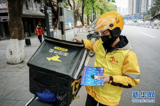 到达送餐的小区后,王淞迅速跟对方取得联系,上门进行配送。据沙坪坝区委政法委相关负责人介绍,通过快递和外卖配送业务来发送宣传制品,是为了让宣传教育活动由人员聚集到分散入户,变集中宣传为流动宣传,同时不降低疫情期间群众参与度。新华网 韩梦霖 摄