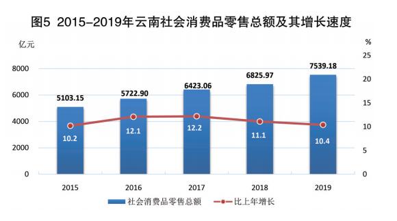 全年社会消费品零售总额7539.18亿元, 比上年增长10.4%。按经营地统计,城镇消费品零售额6490.86亿元,增长10.4%;乡村消费品零售额1048.31亿元,增长10.6%。按消费形态统计,商品零售额6416.31亿元,增长10.4%;餐饮收入额1122.87亿元,增长11.0%。