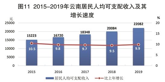 [11]居民人均可支配收入数据由国家统计局云南调查总队提供。居民人均可支配收入指通过住户收支与生活状况调查取得的,调查户在调查期内获得的、可用于最终消费支出和储蓄的总和,即调查户可以用来自由支配的收入,除以家庭常住人口得到的人均收入。可支配收入既包括现金,也包括实物收入。按照收入的来源,可支配收入包含四项,分别为:工资性收入、经营净收入、财产净收入、转移净收入。按常住地分,得到城镇和农村居民可支配收入。