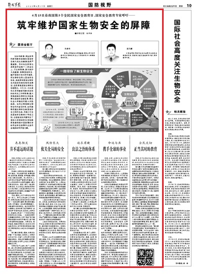 温元麟:今年全民国家安全教育日的活动主题为“坚持总体国家安全观,统筹传统安全和非传统安全,为决胜全面建成小康社会提供坚强保障”。目前,新冠肺炎疫情是全球关注的焦点,开展生物安全教育正当其时。生物安全教育是全社会的事,我们应当调动一切积极因素,积极鼓励全社会参与生物安全宣传教育,形成全党、全军、全社会共同参与的良好局面。应把加强全民生物安全宣传教育纳入贯彻落实防范重大风险的工作部署之中,纳入各级领导干部的议事日程。