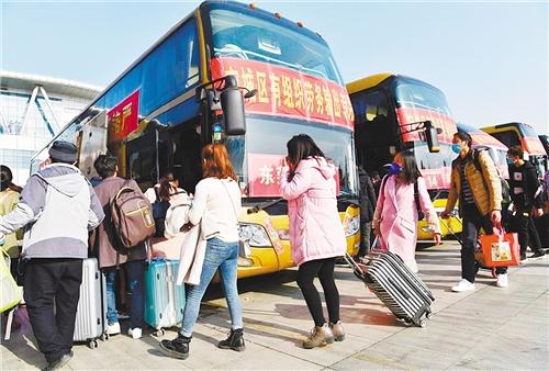 河南省南阳市宛城区组织务工人员乘坐大巴返岗。 陈 琼摄