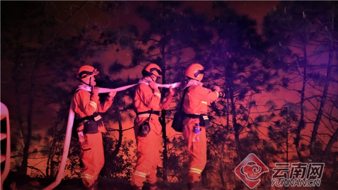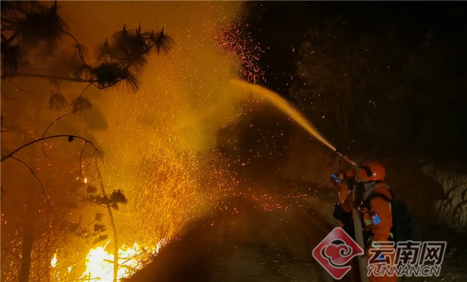 禄劝中队作为辖区内驻守的森林消防队伍,对片区山脉较为熟悉,抵达火场后,该中队中队长任海洋主动请领火势较为凶猛的火场北线,“兄弟们,今晚注定是一个不眠之夜,大家撸起袖子加油干!”由于山高坡陡,在接近70度的陡坡上,5、6级的大风迎面吹来,火借风势,风逞火威,灼人的热浪扑在脸上像针刺一样,山上的荆棘不时和指战员来一个“零距离”接触,他们却顾不上这些荆棘尖刺,因为只有把火打灭,才能还这片天空一片宁静!