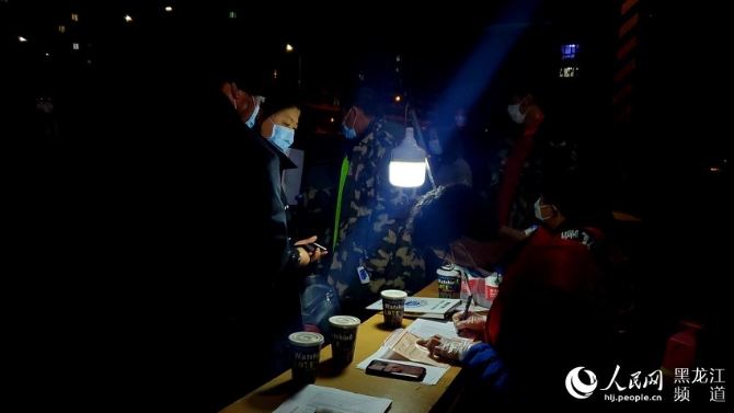 深夜里,志愿者在社区卡口牢筑坚实严密“防疫墙”。张艺开 摄