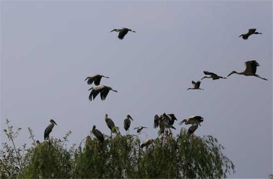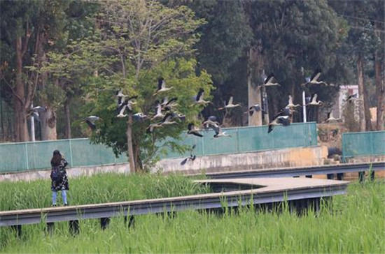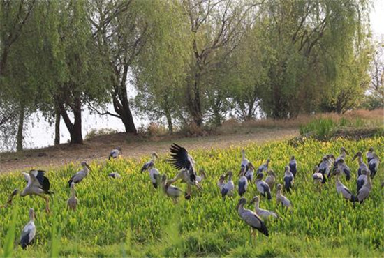 据观察,湿地公园和北岸生态修复带鸟类众多,有些是原来抚仙湖区域罕见的种群,最早出现的是海鸥,之后为白鹭,两类数量较多。湿地中最常见的是黑水鸡,它们栖息在水池或夏天的藕田中,繁殖较快,已有相当的数量。常见的还有戴胜鸟和鹡鸰,多在湿地草坪、荷田觅食。令人惊喜的是,近几日发现了彩鹮、长脚鹬和钳嘴鹳类珍稀品种。各种禽鸟的到来,是保护抚仙湖、维护生物多样性、实现人与自然和谐相处的有力见证。澄江市大力推进抚仙湖生态系统修复和湿地湖滨带建设,荷塘水田及湿地浅水草丛中生活着各类水生植物及鱼虾,贝壳非常适宜这些鸟类栖息、捕食。数百只钳嘴鹳在抚仙湖北岸大东河湿地边觅食。(云报客户端 通讯员张艳秋 杨腊)