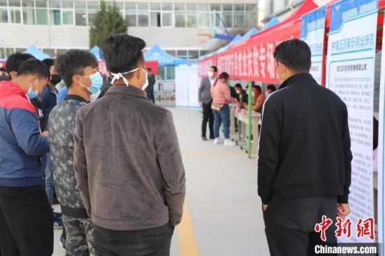 4月中旬,甘肃省临夏回族自治州康乐县迎来扶贫专场招聘会。图为当地民众在招聘会现场咨询。 林瑞祥 摄