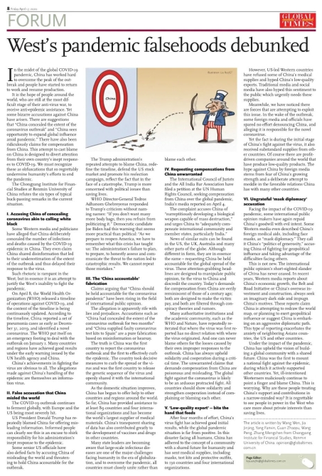 新冠疫情下,国际舆论中出现了无端甩锅中国的“中国责任论”。例如,玻利维亚《玻利维亚报》3月29日发表《中国欠世界一个道歉》社评,转载曾长期担任CNN主持人的美国著名记者帕特里西亚·加尼奥特涉新冠肺炎疫情反华言论,宣扬“中国要为世界疫情负责”,诋毁和污名化中国,抹杀中国防疫的牺牲和成效,忽略他国防疫不力的事实。显而易见,上述言论充斥着谎言和偏见——无论是所谓“中国隐瞒疫情两个月之久”,还是“中国卖给西班牙伪劣试剂”,都是建立在假消息或道听途说基础上的演绎与发挥。
