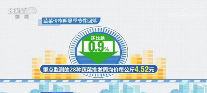监测显示,蔬菜价格明显季节性回落,重点监测的28种蔬菜批发周均价每公斤4.52元,环比跌0.9%,为连续6周下跌,同比低6.6%。