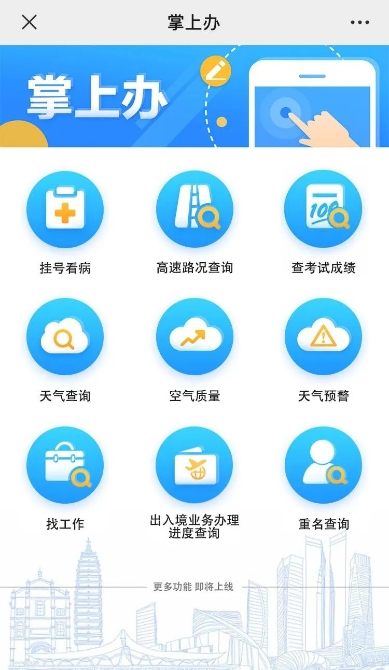 目前,“云南发布”微信“掌上办”汇集了挂号看病、高速路况查询、查考试成绩、天气查询、空气质量、天气预警、找工作、出入境业务办理进度查询和重名查询九大类服务事项。