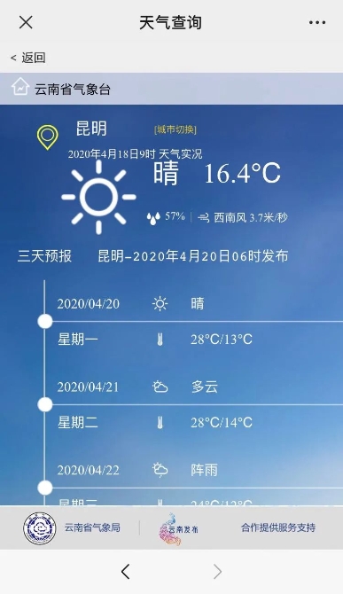 “天气预警”分为省级、州市级和县级三类预警,由云南省气象局实时发布最新预警信息,提醒民众及时做好防范措施。