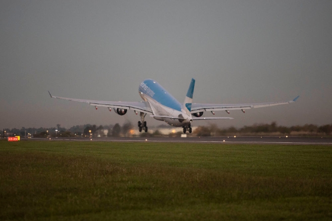 4月17日,在阿根廷布宜诺斯艾利斯埃塞萨国际机场,一架包机起飞前往中国上海运载防疫物资。新华社发(马丁·萨巴拉摄)
