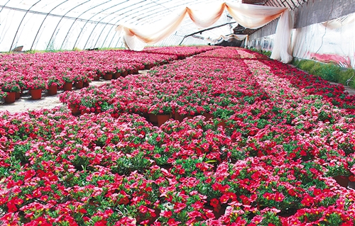 马昌营镇众力和花卉种植专业合作社种有舞春花、凤仙花、海棠、矮牵牛等几十种花卉品种,主要供应世博园、鲜花港等地,并用于北京城区一些鲜花布景。在设施大棚内,工人们浇水、修剪、包装,准备外运鲜花上市,一派忙碌景象。