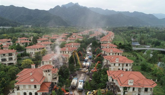 2018年9月6日,大型机械对“群贤别业”内的别墅进行拆除。(图片来自新华网)