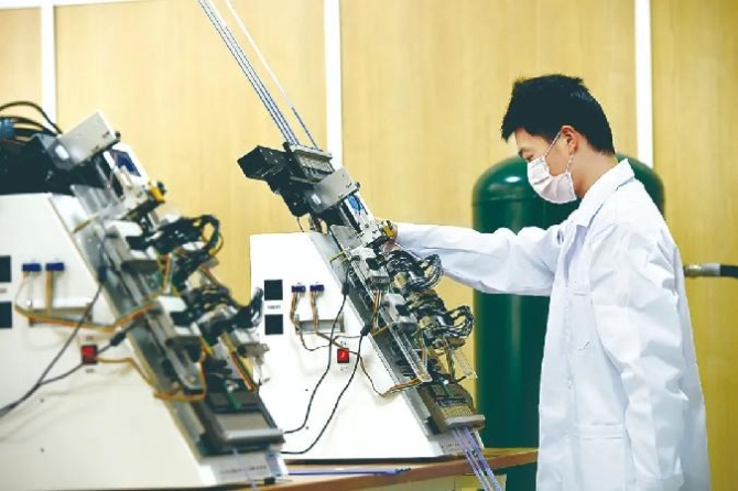 近日,合肥恒烁半导体有限公司成功研发面向物联网应用的50纳米128M高速低功耗NOR Flash存储芯片,可应用于人工智能、汽车电子、手机等行业,目前已实现量产。图为4月18日,工作人员对芯片进行测试。新华社发(周牧 摄)