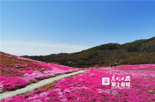 昆明信息港讯(昆明日报 记者冉光雯 通讯员柏斌)四月芳菲醉,人间重春时,山野欣然,大地芳香,处处繁花盛开。在云南昭通昭阳区苏家院镇白虎山花卉盆景主题庄园中,激情绽放的千亩芝樱花海灿如云霞,吸引众多游客前来踏春赏花。