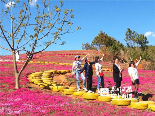 进入庄园,只见远处漫山满坡的芝樱花粉若凝脂,像一张与天际无缝衔接的大地毯,从山顶倾泻而下。沿着黄色、蓝色的废旧车轮胎筑就的园路小路漫步花海,一朵朵、一簇簇的芝樱花粉的娇俏、红的明艳、白的温润。一阵微风吹来,花浪翻滚、摇曳多姿。如梦似幻的浪漫花海与阳光蓝天白云映衬,与周边翠绿茂林相伴,像一幅美丽的生态画卷。前来拍照游玩的游客说:“在家里宅的时间长了,趁着好天气,带着小孩出来走,没想到这地方环境好、景观美,在家门口就能欣赏到日本北海道芝樱花海景观。”