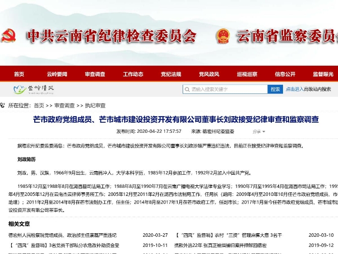 昆明信息港讯 据德宏州纪委监委消息,芒市政府党组成员,芒市城市建设投资开发有限公司董事长刘政涉嫌严重违纪违法,目前正在接受纪律审查和监察调查。