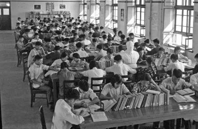 △1959年,学生们在西迁后的交大校园图书馆阅览室内学习。