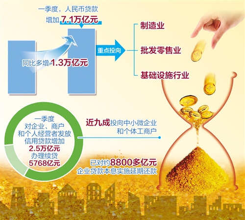 二是及时提供流动性支持,帮扶中小企业渡过难关。一季度末普惠型小微企业贷款同比增长25.93%。一季度对企业、商户和个人经营者发放信用贷款增加2.5万亿元,办理续贷5768亿元,近九成投向中小微企业和个体工商户。对企业贷款实施延期还本付息政策,已对8800多亿元贷款本息实施延期还款。
