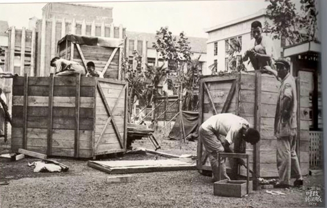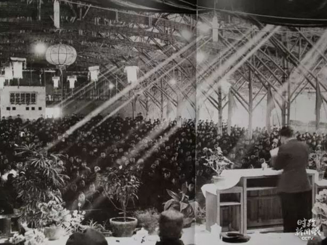 △1957年,学校的大礼堂还没有建成,学校请来工匠用竹子搭建了这座临时“草棚大礼堂”。在很长一段时间里,学校开大会、文艺演出、放电影都在这里进行。