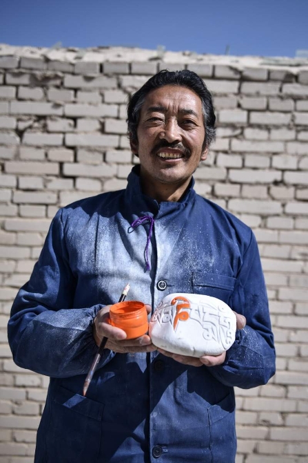 青海省格尔木市唐古拉山镇长江源移民新村村民才仁奶梅在展示一块未完工的玛尼石。