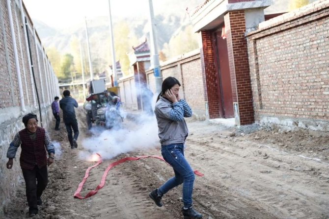 在青海省民和回族土族自治县松树乡牙合移民新村,贫困户胡秀英(前)在新家的门口放鞭炮庆祝搬家。