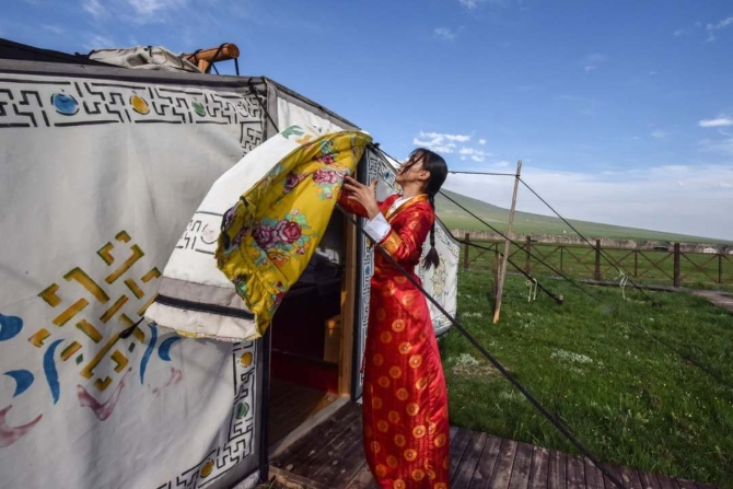 祁连山生态牧场的一名工作人员在收拾帐篷宾馆。