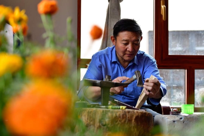 青海省玉树藏族自治州玉树市的藏刀匠人更求彭措在制作藏刀刀鞘。