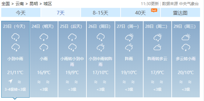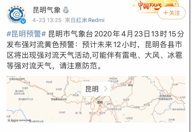 据昆明市气象台2020年4月23日13时15分发布的强对流黄色预警消息,预计未来12小时,昆明各县市区将出现强对流天气活动,可能伴有雷电、大风、冰雹等强对流天气!