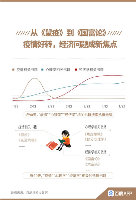 从阅读内容来看,经典深入人心,也无碍阅读世界百家争鸣。“四大名著”热度年胜一年的背后,是人们对传统文化的热爱日益提升。疫情变化也对网友阅读口味产生了一定影响。《报告》显示,在疫情暴发之初,与“疫情”相关书籍的搜索热度迅速上升,《鼠疫》《花冠病毒》等具有疫情背景的书籍成为热搜。随着国内疫情好转,疫情对心理、经济的影响逐渐受到人们更多关注,《焦虑急救》《国富论》等心理学、经济学相关书籍的搜索热度均在3月上涨。3月以来,随着全国各地陆续复工,专业类书籍的搜索热度开始上涨。