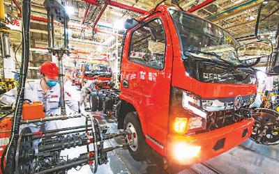 目前,湖北省襄阳市规模以上工业企业复工1625家,复工率99.4%,员工复岗率99.6%。图为4月23日,位于襄阳市的东风汽车股份轻型商用车分公司内,技工们在总装车间生产线上装配轻型卡车。