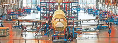 3月6日,工人在中国商飞上海飞机制造有限公司的生产车间内作业。新华社记者 丁 汀摄
