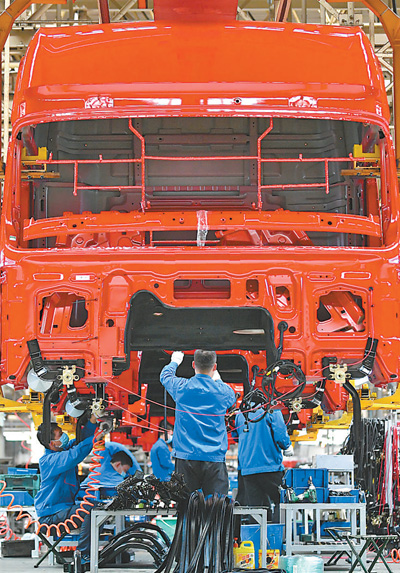4月23日,工人在陕西汽车控股集团有限公司重卡总装线工作。新华社记者 张博文摄