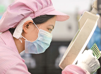 3月31日,在中国信科集团烽火通信公司系统设备制造部的5G智造车间,工人正在生产相关设备。本报记者 李 舸摄