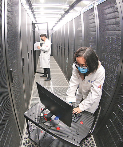 3月24日,中国移动(襄阳)数据中心,网络工程师在新型绿色仓储式数据中心进行网络调试。王 虎摄(人民视觉)