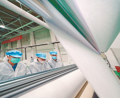 4月23日,燕山石化工人正在熔喷无纺布生产线上工作,该生产线仅用时12天就建成投产。本报记者 贺 勇摄